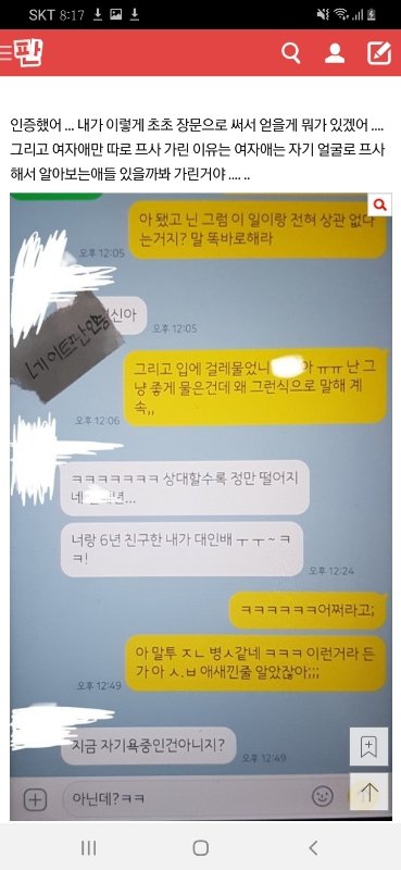 ++))+6년친구랑 말하고 있는데 모르쇠로 일관해 주작아니라고 인증을 어떻게 해줘야 믿을거야..? zzㅋㅋ.. 가린건 프로필이야