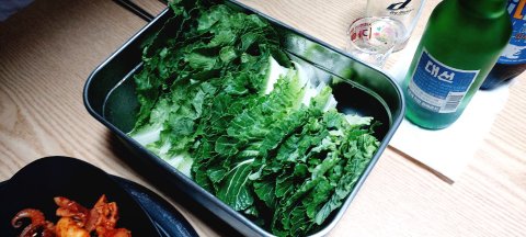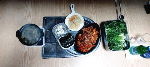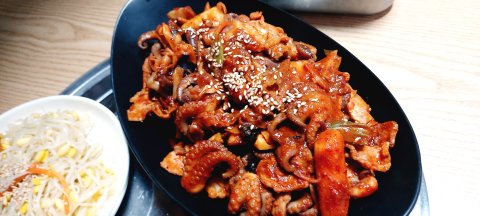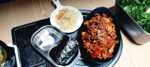 쭈꾸미 삼겹살 볶음에 쌈채소에 마른김 콩나물 마요네즈