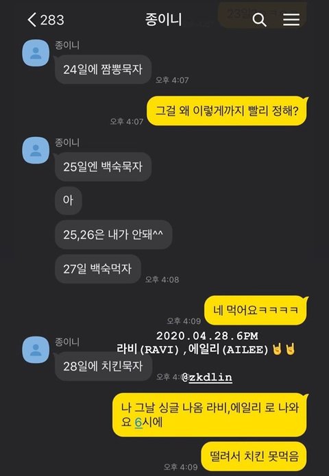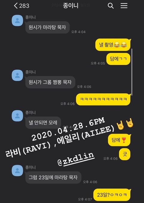 앞으로도 응원할게ㅎㅎㅎ 그리고 라비랑 종인이는 마라탕이랑 백숙 먹을 때 셀카 찍어 올려주기 약속