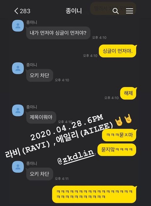 라비 곧 싱글 발매한다고 28일에 치킨먹자는거 떨려서 못먹는다하니까 응 차단~ 하는겅ㅋㅋㅋ