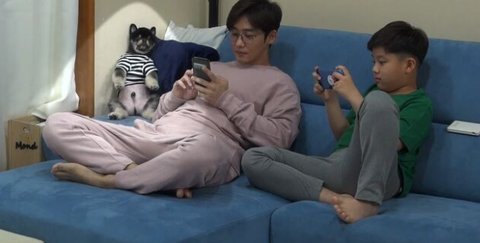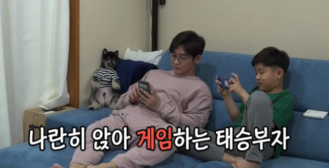 소파에 나란히 앉아 게임하는 태승부자 뒤에