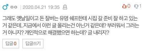 끝으로 이 글이 주작이다. '스타쉐프'에게 시집가는 A가 부러워서 올린 글이라는 댓글이 있는 걸 압니다. 저는 그런 유명세가 부럽지 않은 사람이고 저는 이런 일들이 있었음에도 방송에 나오기 전 혹은 살아가면서 단 한 번도 저에게 미안하다고 사과하지 않았으면서 행복한 것처럼 방송에 나오는 것이 보기 힘들어 올리게 된 글입니다. 제가 연락한 증인 2~3명은 이 일과 연관이 분명히 있습니다. 또한 저는 A가 방송에 나오기 이전에도 이런 일들을 겪은 바가 있다고 측근들에게 말한 적이 있습니다.