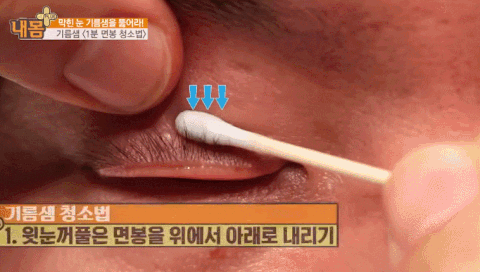 이렇게 해줘!!근데 꼭 이렇게 해야 되는 건 아닌 것 같아!그냥 요래 저래 눈꺼풀을 문지르고?누르다 보면 아까 그 모공 같은 곳? 아마 기름샘인것같아 잘은 모르지만!! 하여튼 거기에 뭔가 기름이 송글송글 맺히는게 보일거야!! 그러면 그걸 면봉으로 슥 닦아주면 면봉이 노랗게 된다!!