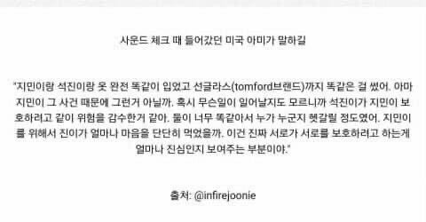 지민 살해협박하고 다니는 싸패가 설치고 다니던 기간에 콘서트가 있었는데 진이 지민이랑 같은옷 입고 인상착의 최대한 비슷하게 했다함