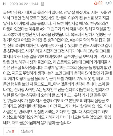 폭행 가해자는 반성과 사죄 없이 TV나 유튜브 같은 공개된 플랫폼에 나올 생각하지 마시고 힘들고 어렵겠지만, 저를 포함한 모든 학폭 피해자들이 자신을 더 포용하고 사랑해서 보란 듯이 잘 살았으면 좋겠습니다. 덧붙여 학폭 가해자 분들이 사과 후 짧은 자숙 이후 다시 방송 활동을 하는 걸 많이 봐온 저로써는 이번 일이 쉬이 사그라들지 않고 가해자들의 설 자리가 피해자들을 위해서라도 줄어들기를 바랍니다.