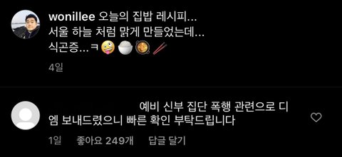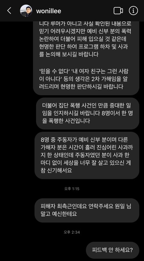 제가 또 글을 작성하게 된 이유가 있습니다. 첫째로 집단폭행 가해자 PD가 쉐프의 인스타그램에 ‘사실 여부를 부정하는 듯한’ 사과문을 올렸지만 연락을 취하겠단 말은 그저 말뿐, 저에게는 아직까지도 연락을 하고 있지 않기 때문입니다.