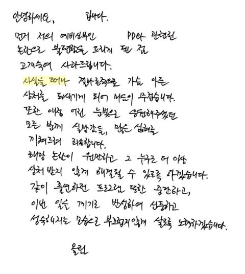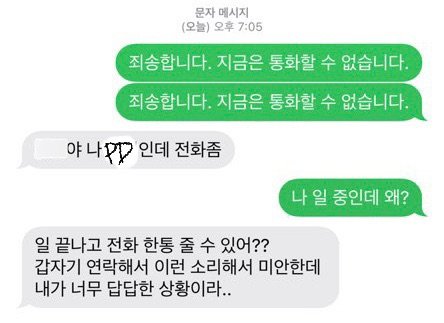 PD는 제가 누군지 똑똑히 기억하고 있습니다. 그 증거로 PD는 어제 오후 7시부터 저에게 진심 담은 사과 후 좋은 관계를 이어나가고 있는 Y(라고 표시하겠습니다) 에게 여러 차례 전화를 걸었고 연락을 취했습니다. Y는 판이 올라온 것을 보고 저에게 연락했었으나 제가 댓글 및 언론사 컨택 등으로 상황 파악을 하느라 연락을 받지 못하는 동안 PD가 Y에게 연락한 것입니다.