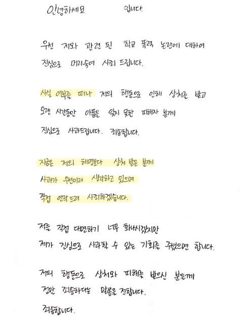 제게는 연락 한번 없이 일방적인 가해자 입장에서의 사과문에 ‘사실 여부’를 떠나 사과한다는 말로 2차 가해를 하시고 그 덕분에 3차 가해를 하는 댓글들이 달리고 있다는 사실도 알고 계신가요?