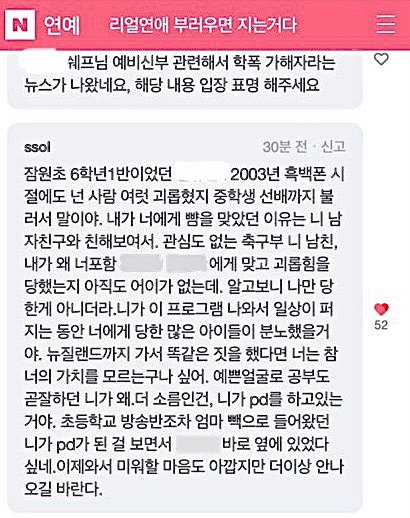 그 내용은 PD의 성격이나 행동에 대한 것이 아닌 ‘당시 집단 폭력 주동자인 PD의 남자친구 B가 다른 여성분과 성관계를 했다 ’라는 내용입니다.