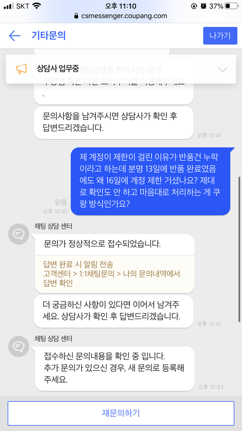 분명 쿠팡에서 쿠팡 측 실수라서 구매자인 제 잘못은 없다는 걸 확인 받고 환불 진행했는데 갑자기 계정 제한을 걸길래 어이 없어서 문의 넣었습니다.