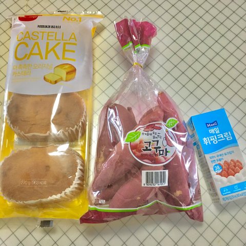 3. 고구마 삶기, 차갑게 해놓은 휘핑크림 100ml 휘핑자국이 보일때까지 휘핑해주기