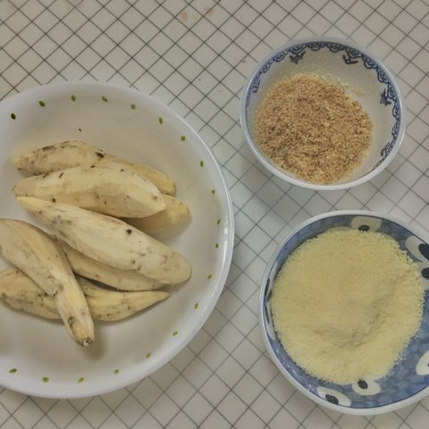 2. 고구마 껍질 미리 까놓기, 카스테라 1개를 체에 갈아서 데코용 가루 만들기