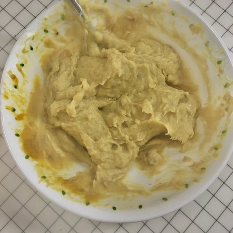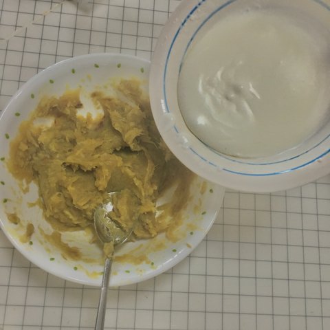 4. 고구마를 으깨고 만들어놓은 휘핑크림, 물엿 3큰술 넣고 섞기