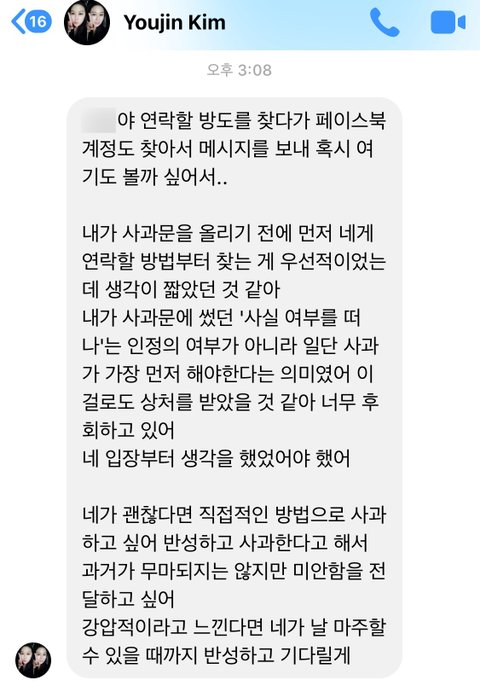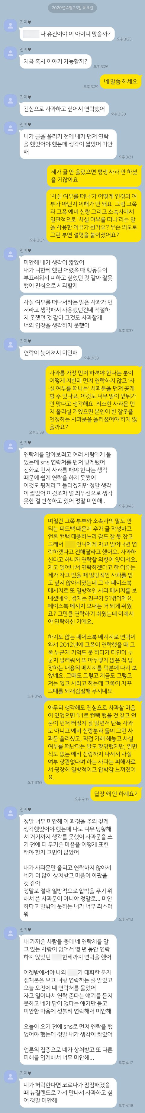 어제 오후 1시쯤 가해자 PD, 그의 예비 신랑, 그리고 소속사의 ‘사실 여부를 떠난’ 사과문이 올라오고 제가 두 개의 추가 글을 올린 후 오늘 오후 3시에 김유진 PD에게서 페이스북을 통해 처음으로 연락을 받았습니다.