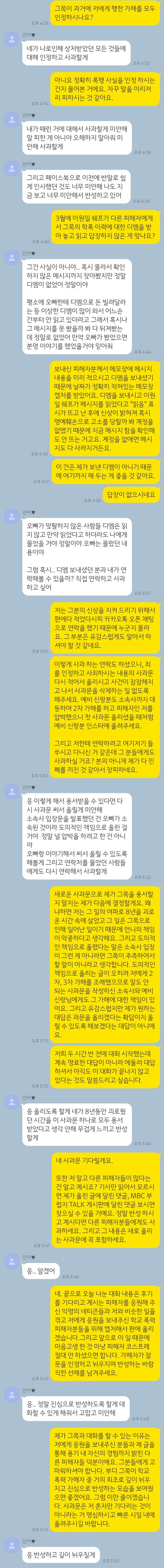 김유진 PD와의 대화에서도 밝혔듯, 제가 가해자와 대화를 나누려고 마음을 먹은 이유는 저에게 응원을 보내주신 분들과 제 글을 통해 용기 내서 자신의 경험까지 밝힌 피해자들이 계시기 때문입니다. 공론화를 마음먹은 이유도 가해자가 사과와 반성 없이 떳떳하게 살아가는 사회에 신물이 나서라고 밝혔습니다.