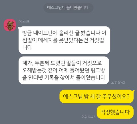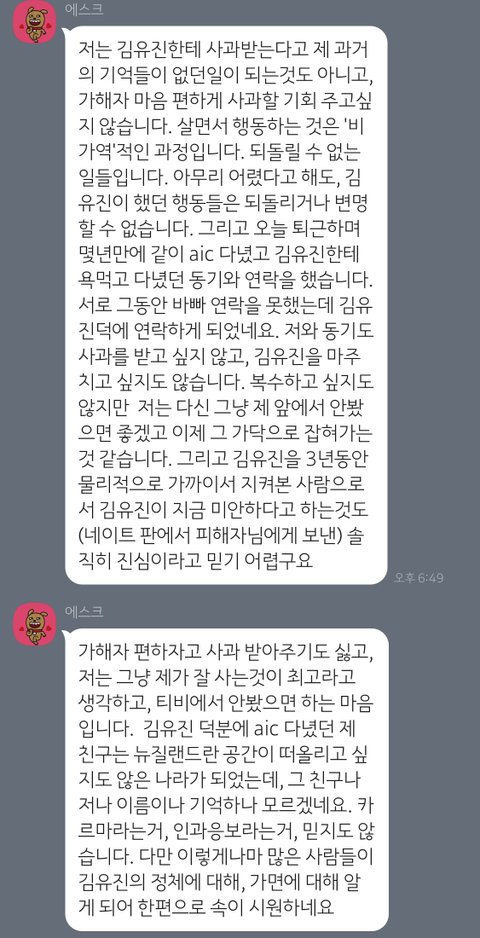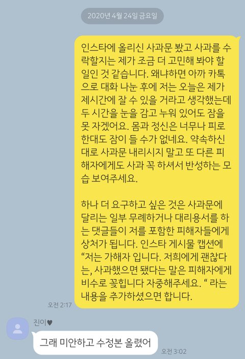어떤 분들께서는 제가 카카오톡 메시지로 사과를 받은 것에 대해서 또 그 대화 내용을 올린 것에 대해서 “이렇게 하면 가해자가 사과했으니 됐어 할 것이다. 사과도 받아주지 말고 대화도 하지 말아야 한다.” 하시는 분들도 계십니다. 제 상황이 안타까워 같이 분노하기에 하시는 말씀임을 압니다.
