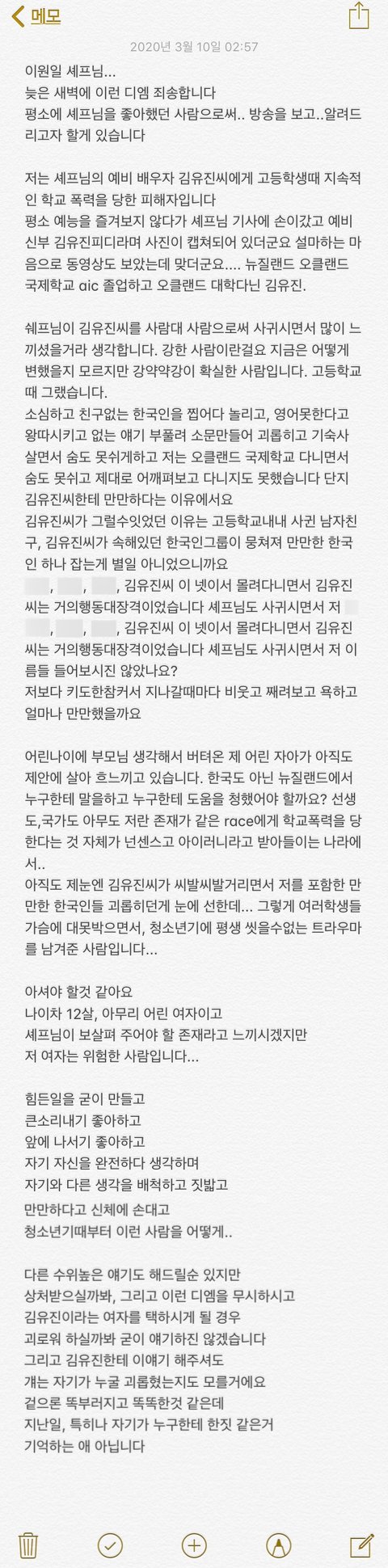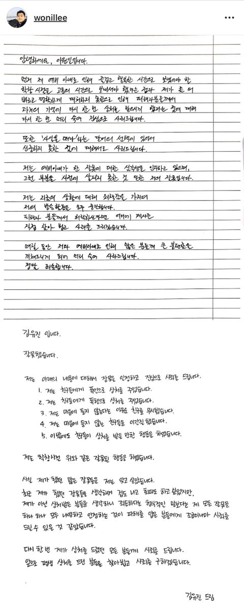 거듭 언급했듯이, 이 일은 저 혼자만의 일이 아니고 김유진 PD에게 피해를 본 다른 피해자와 또 모든 학교 폭력 피해자들의 일이라고 생각합니다. 때문에, 김유진 PD가 피해를 밝힌 모든 피해자에게 연락하여 사과하는 게, 올바른 선례를 만들 꼭 필요한 중요한 과정임을 강조하고 싶습니다.