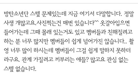 첫 사진 핸드폰은 사생이 아니라 방밤 언니분 아님? 눈치 안보고 대놓고 찍는건 스태프가 방밤 영상 올리려고 찍는 것 같은데. 저거 영상보면 뷰도 다른 각도 2개일걸? 맨 위에건 내리는게 맞고 나머지 2개는 이상함. 2번째 사진은 누가봐도 방밤찍는게 아니라 몰래 도촬하는 거고 3번째 담배인가? 전에 방탄 데뷔초때도 스태프 담배치고 그러지 않았나?