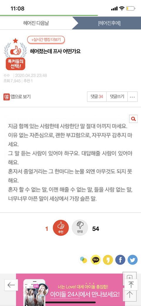 이제 한달 지남 한번도 안잡아준 그사람이 너무나 미웠음 하지만 나는 나를 사랑하지 않는 사람을 놓친거지만 그사람은 자기자신을 사랑해..