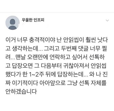 물론 처음에 내가 선연락을 했는데 상대방이 쭉 안읽으면 좀 짜증나겠는데, 어느정도 대화하다가 안읽씹하는건 아무 생각이 안듦