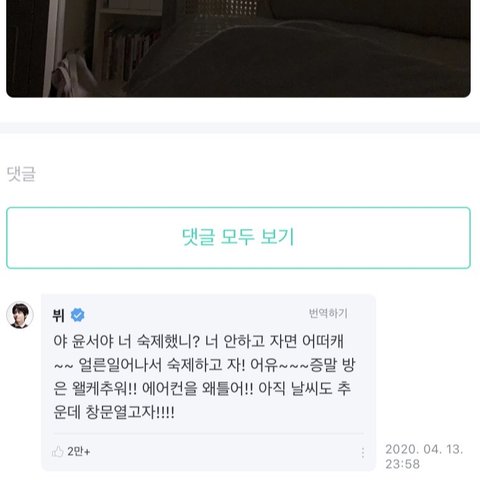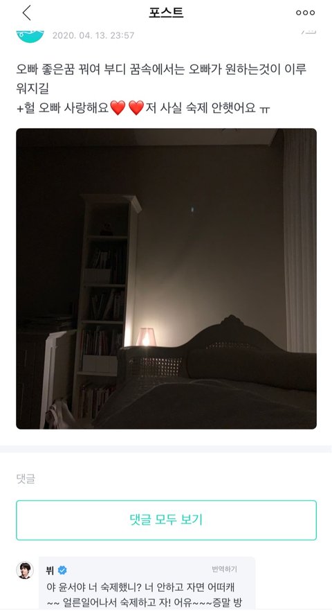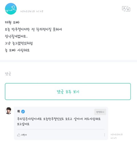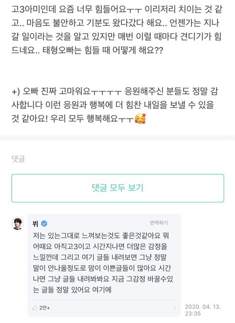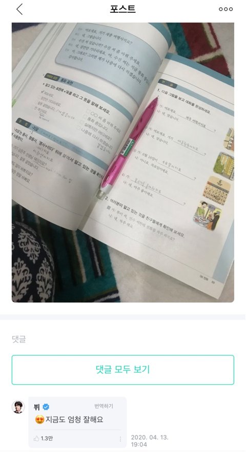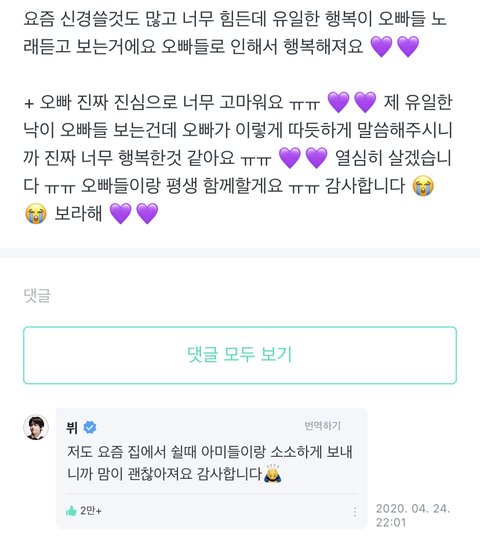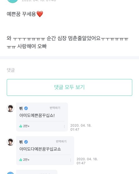 더 첨부하고싶은데 12개밖에 못올리네ㅠㅠ 이거말고도 따숩고 웃긴댓글들 많이달아줘ㅋㅋㅋㅋ이렇게 팬들이랑 놀고싶어하고 따뜻한댓글도 많이달아주는데 팬들이랑 장난친 댓글들을 안티들이 이상하게 해석해서 욕하는거보면 정말 마음아프다 방탄뷔는 팬들이랑 소통하거나 게임하면서 행복을 얻는아이야ㅠㅠㅠ 나는 뷔의 진심을 많은사람들이 알아줬음 좋겠어서 쓴글이야!! 긴글 읽어줘서 고마워!!