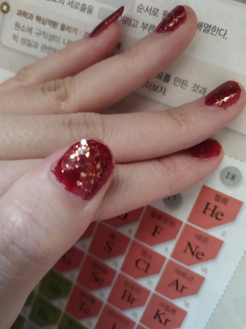 매니큐어 칠하는거 너가 칠한거 같은데 너는 그냥 샵을 가야겠다.. 손톱에 안칠해진 부분도 많고 삐죽삐죽 튀어나온 매니큐어도 많아서 안예뻐 펄은 그냥 안하면 되는데 니가 매니큐어를 혼자 바르는건 잘 못하는 듯..
