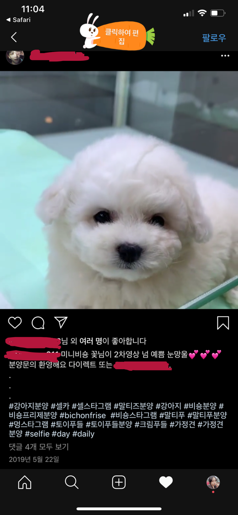 * 카카오톡으로 보내주었던 동영상은 **숑 인스타에 2019년5월22일날 올렸었던 분양글의 동영상이었음