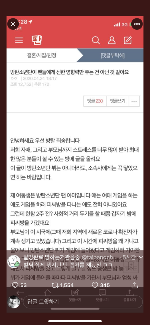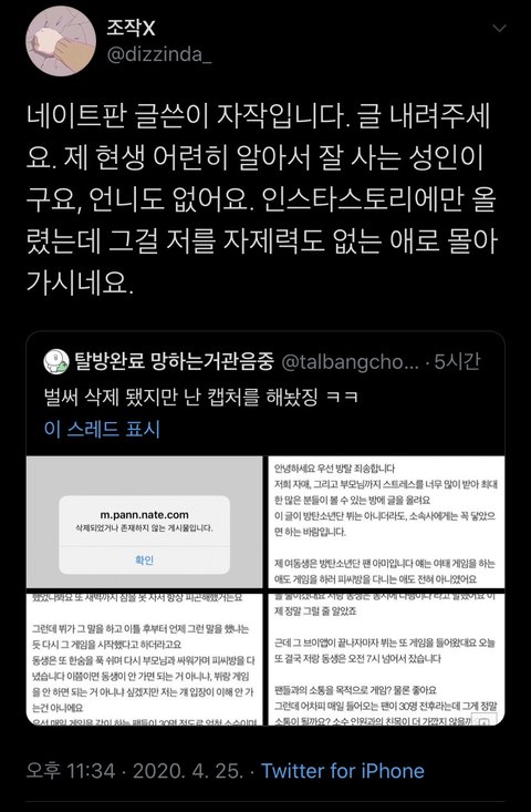 결시친에 올린거 봤었어. 딱 봐도 트윗냄새 나길래 쌤 말투가 일반인 같아서 못 알아볼뻔 했다고 댓도 남겼었음. 근데 삭제 했더라 ㅋㅋㅋ 이젠 ㅇㄱㄹ구분하는데 도가 튼것 같음. 엔터판도 아미들도 ㅇㄱㄹ들이 얼마나 교묘한지 알았음 좋겠어. 쟤네도 저 정도 정성으로 현생살면 뭘 해도 성공할텐데 안타깝... 화력 센 결시친까지 글 쓴 정성이라니..짹에서 알계 비계들이 까내리는거 결국엔 다 해명되고 맞는거 하나도 없었음. 지들 망상이었음. 혹시 아미들중 거기에 휩쓸릴 멘탈이면 트윗을 걍 안했음 좋겠다는게 내 생각. 망상은 끝이 없음