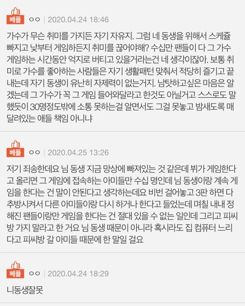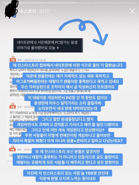 그리고 댓글은 뷔 팬인 동생에게 '자제력이 없다' '니동생잘못' 이라며 욕했습니다.