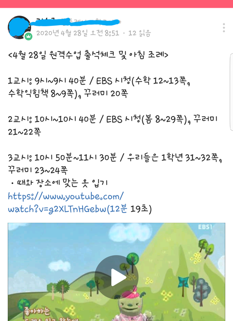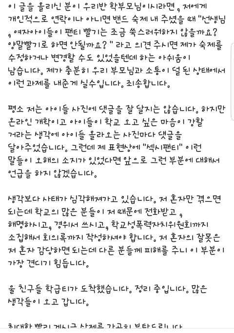 '예약전송글'이 문제가 아니라 다음날이 되도록 학급밴드폐쇄는 커녕, 문제가 되었던 숙제사진조차 전혀 지우지않는 선생님의 뻔뻔한 신념입니다.