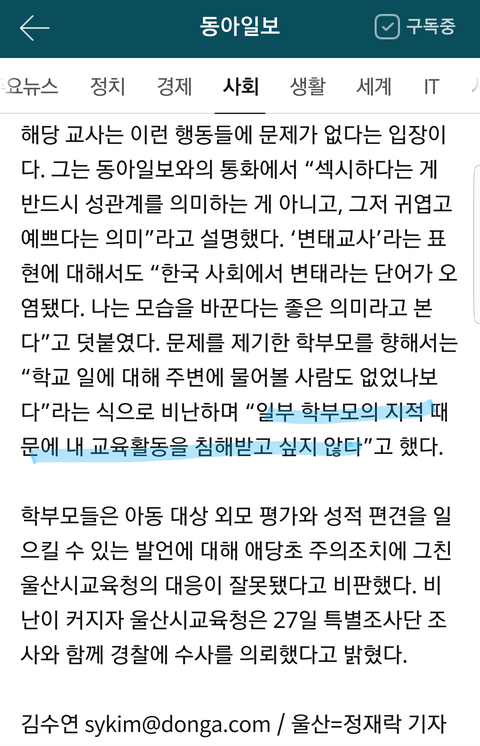 * 업무에서 즉각 배제시켰다는 기사 내용과는 다르게 '일부 학부모의 지적때문에 내 교육활동을 침해받고싶지않다던' 신문사와 인터뷰대로 다음날 평소와같이 아침 조례를했고. 교육청에서는 '예약전송글' 이라는 말로 해명했습니다.