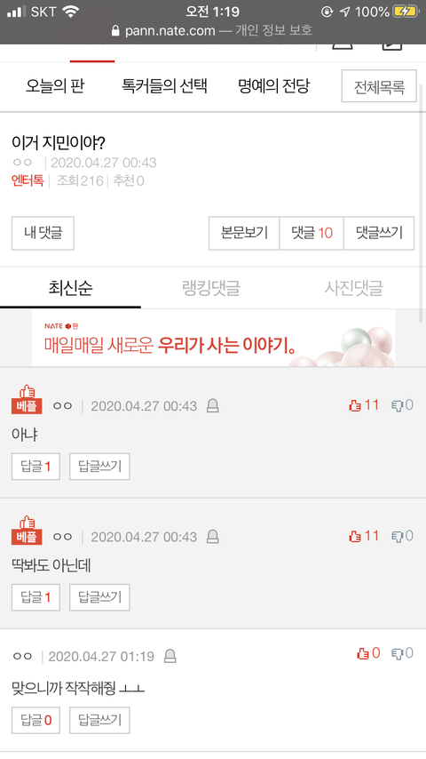 베플이 조작된걸로 추정되는 게시물입니다 먹금해주세요