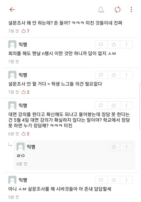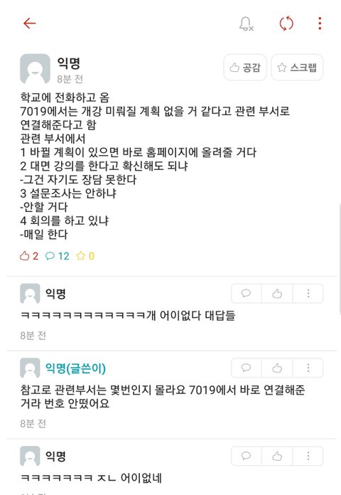 얘들 저거 보고 지금 에타에 항의 글 엄청 올라오고 있어 심지어 지금도.. 남들은 다 개강 미루고 있는데 왜 우리만 안미루고 이대로 진행한다는지 모르겠어 학생들이 똑같은 지역에서 오는 것도 아니고 각 지역에서 오는데 심지어 대구 부산에 사는 얘들도 오는 이 상황에서 굳이 대면 강의를 해야 해? 대면 강의 했다가 코로나 걸리면 그 뒷일은 누가 책임지며 한번 걸리면 부모님은 물론이며 개는 학교생활 사회생활 끝일텐데 개 인생은 어떻게 책임질건데?