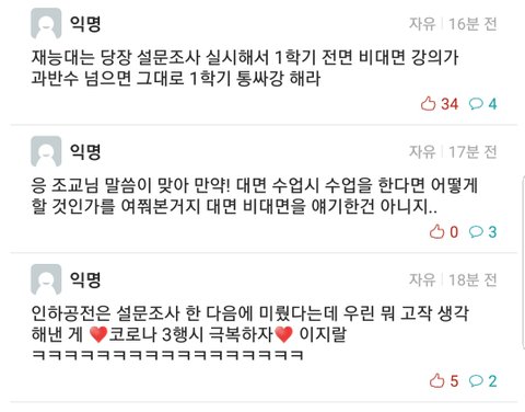 얘들 저거 보고 지금 에타에 항의 글 엄청 올라오고 있어 심지어 지금도.. 남들은 다 개강 미루고 있는데 왜 우리만 안미루고 이대로 진행한다는지 모르겠어 학생들이 똑같은 지역에서 오는 것도 아니고 각 지역에서 오는데 심지어 대구 부산에 사는 얘들도 오는 이 상황에서 굳이 대면 강의를 해야 해? 대면 강의 했다가 코로나 걸리면 그 뒷일은 누가 책임지며 한번 걸리면 부모님은 물론이며 개는 학교생활 사회생활 끝일텐데 개 인생은 어떻게 책임질건데?