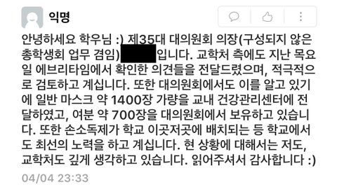 2.이 사진은 재능대학교 대의원회 회장이 학교가 개강을 준비하는 대안들을 설명한 댓글입니다. 재능대학교 학생 수는 총 6236명으로 마스크를 2100장을 준비하였어도 모두가 사용할 수 있는 양이 아닙니다.