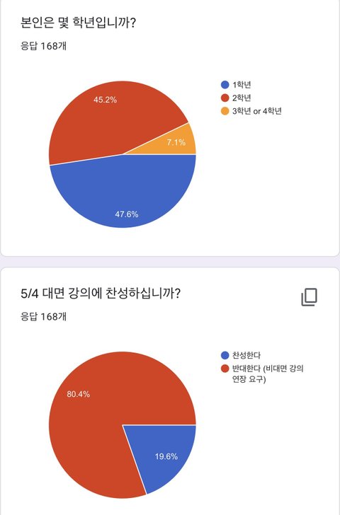 3, 아래 사진은 학생들이 자체적으로 실시한 설문조사의 결과입니다. 총 167명이 참여한 설문조사이고 약 80%가 비대면 강의의 연장을 요구하였고 약 20%의 학생은 대면 강의를 요구하였습니다. 물론 이 결과 하나로 재능대학교 학생들의 의견을 다 보여줄 수는 없습니다. 하지만 학교 측에서 학생들을 상대로 한 설문조사를 실시하지 않아 학생들이 학교에게 의견을 전달하고 대체적인 분위기 파악을 위해 자체적으로 실시해보았습니다. 이 결과를 학교 측에 전달하여 비대면 강의의 연장을 요구하였고 설문을 실시해달라고 요구하였지만 돌아오는 답변은 ‘설문은 하지 않을 것이다.’ 였습니다. 학교는 교직원과 학생을 위해 만들어진 곳이고 학생과 교직원 모두가 협력하여 운영되어야 한다고 생각합니다. 하지만 학생의 의견은 들어보지 않고 교직원들 마음대로 정하겠다 라는 학교 측의 의견은 이해되지 않습니다.