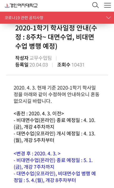 학교:미뤄질 계획은 아직 없고 변경사항이 있으면 바로 홈페이지에 게시합니다.