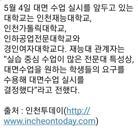 우선 경인여자대학교의 경우 비대면 수업과 대면 수업을 동행하여 실시한다고 합니다. 인하공업전문대학교의 경우 5/1까지였던 비대면 수업 기간을 5/23까지 연장을 한다고 합니다. 하지만 재능대학교의 경우 아직까지도 아무런 공지도 없을 뿐더라 전화를 통해 대면 강의 시작에 대한 계획을 물어보면 ‘저희도 모른다. 회의하는 중이다.’라는 대답 뿐입니다.