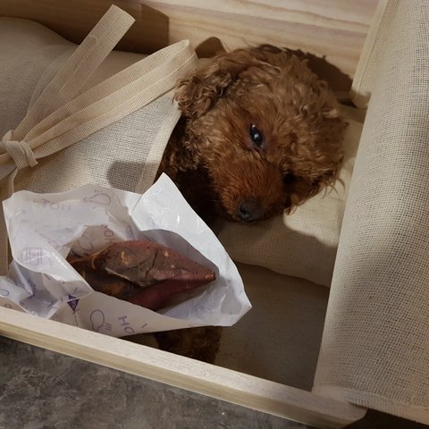 일산의 반려동물 장례식장에 도착할 때까지 도톨이는 저와 와이프의 품 속에서 편안히 잠든 채 안겨 있었습니다. 하늘나라로 산책을 떠나는 도톨이를 위해 그리도 좋아했던 군고구마를 든든히 챙겨주고, 저는 평소 도톨이와 산책했던 복장으로 가자!를 외쳤습니다. 가자! 소리만 들어도 신나서 방방 뛰었던 도톨이는 그렇게 하늘나라로 신나게 뛰어갔습니다.