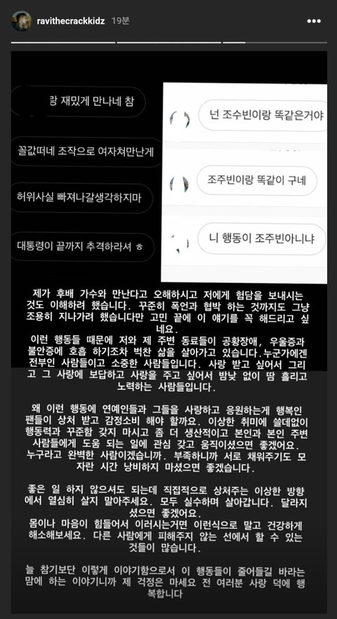 미친애들 참 많아.. 라비처럼 아이돌들 숨기지 말고 그냥 다 말하는게 좋을듯 저건 빙산의 일각일텐데