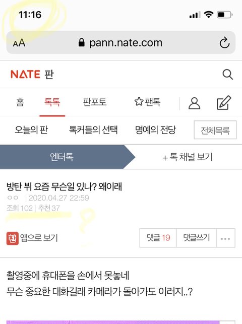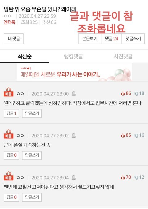 주 대상자 뷔랑 정국이인데 네이트판 자주보는 정국,뷔까글 온갖 어그로 쟤네짓 매번 뷔팬 정국팬인척 어그로끌고 팬덤분열 시키려함