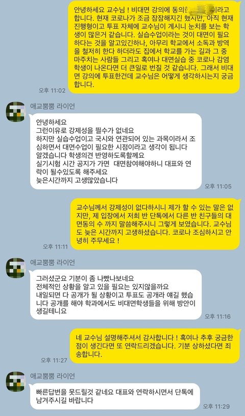 만약 저희 중 누구 하나라도 걸리면 분명, 대면강의에 찬성 했으니 자기는 책임질 것이 없다고 하시겠죠.