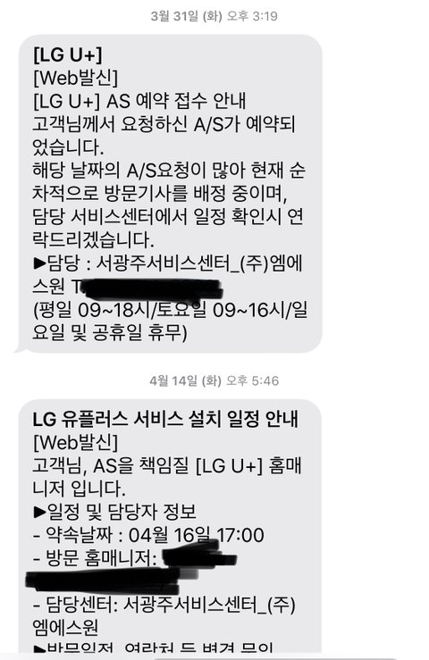 신청은 3/6에 했고 as는 3/31 연락드렸어요 방문은4/6에 오셨구요 기계를 새로 바꿔주셨고 그리고 프리tv는 아직 엘지유플에서 활성화가 안되서 기사님들조차도 설치부터 버벅거리고 다른 기사님한테 전화해서 설치해봤냐고 어떻게 하냐고 물어보는 기사님도 있었어요 무튼 방문했던 두기사님다 기계 개통을 버벅 거렸어요.