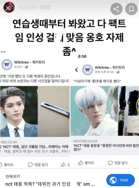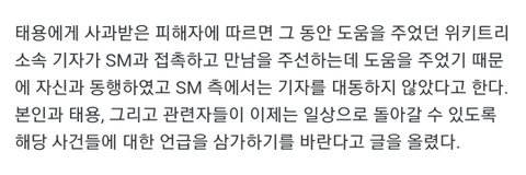 그리고 뭔 오늘올라온 루머글보니까 위키트리 기사 가져와서 태용이가 자해시킨거처럼 써놨더만 ;; 위키트리 그거 일부러 그렇게 제목만 자극적인 기사써서 그런거임 기사들 자세히 읽어보면 자해소동 태용이랑 전혀관련없는일임 그리고 그루머글 댓보니까 뭔 피해자가 10명이니 강약약강이니 ㅇㅈㄹ하던데 같은반동창이 강약약강인애 아니였고 이태용은 가해자보단 방관쪽에 가깝다 그랬었어.. 그렇다고 방관이 죄없는건아니지만 사과도했고 피해자도 용서했잖아. 최근 슈퍼엠 활동 끝나고도 만난걸로 알고있는데 언제까지 끌올할거야 도대체 ㅋㅋㅠ 하