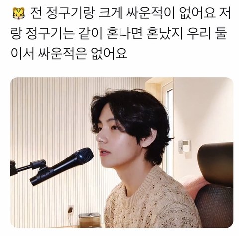 방탄 내 모든 케미 좋아하긴 하는데 다른 형들은 정국이한테 되게 형같은데 뷔형이랑 정국이는 뭔가 가끔 너무 친구같아서 좋앜ㅋㅋ데뷔초에 라디오에서 태형이한테 누구랑 방쓰고 싶냐는 말에 정국이랑 같이쓰면 너무 웃길것같다고 그러곸ㅋㅋ정국이는 태형이 인생친구라 하고 ㅋㅋㅋㅋ