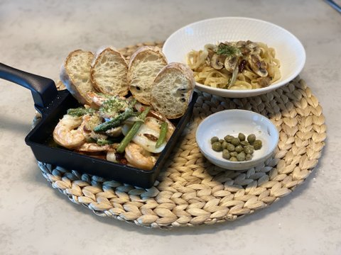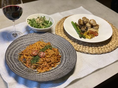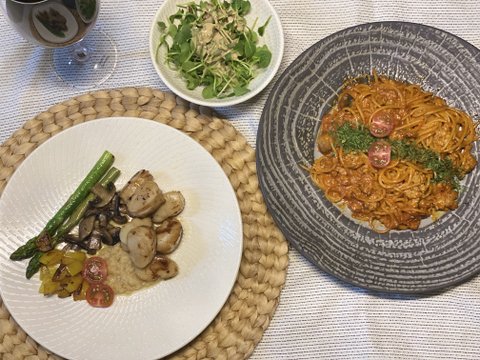 관자 스테이크와 고추장 파스타예요