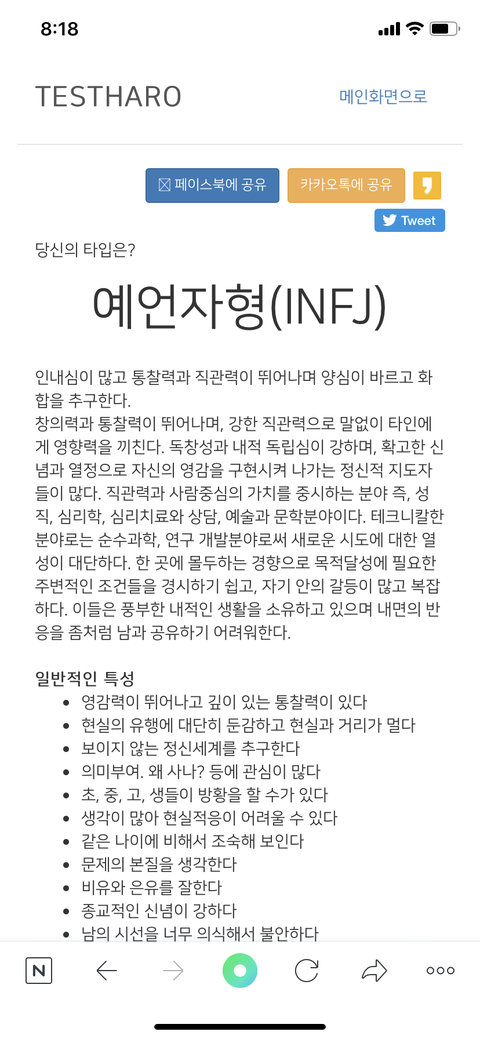 작년에 학교에서 할때 ESTP 나왔는데 방금 인터넷 거 해보니까 INFJ 나옴 근데 학교거가 더 문제수도 많았고 ㅈ나랑 잘 맞는듯 근데 뭐지 왜 저렇게 다르게 나오지