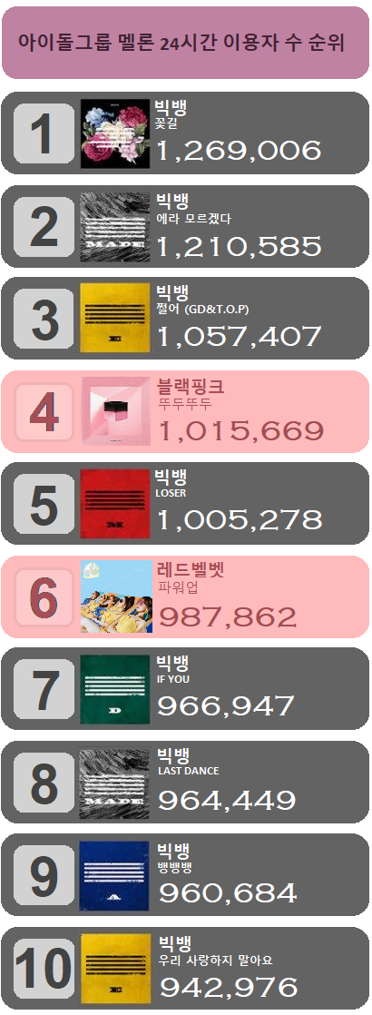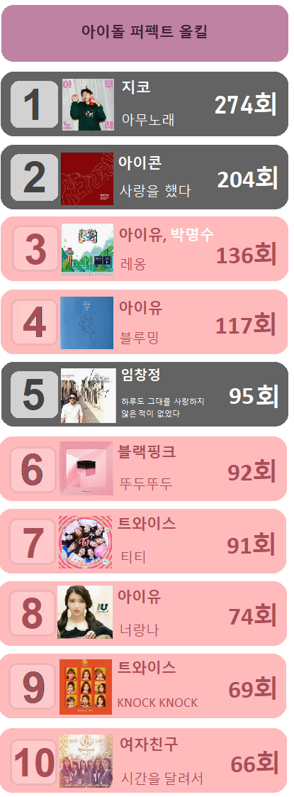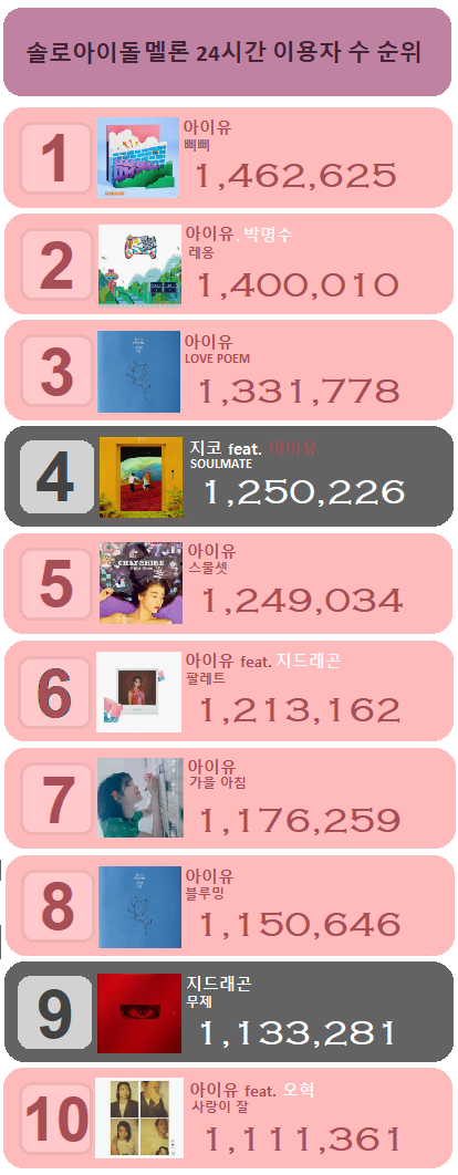 아이돌그룹과 솔로 멜론 24시간 이용자 수 순위 + 퍼펙트 올킬