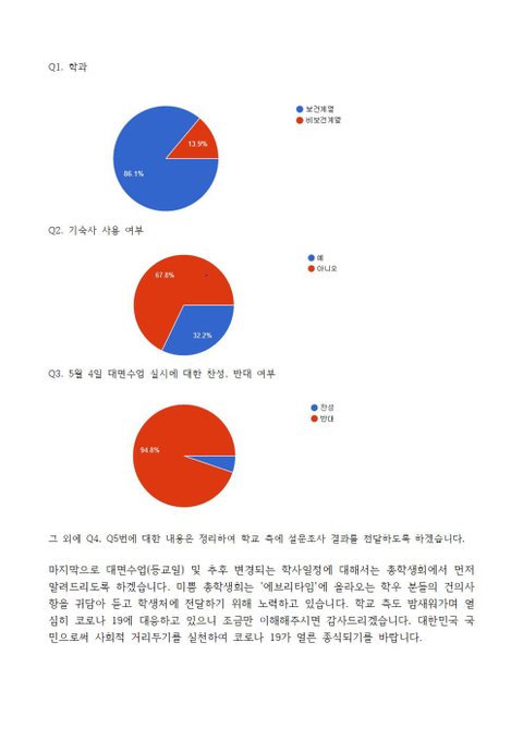 -> 이론 수업은 온라인 수업이 가능하다고 했으나 대면 강의가 필요 없는 이론 수업의 경우도 교수들이 대면 강의를 시킴. (학생들의 투표로 이루어진 결과가 아님)