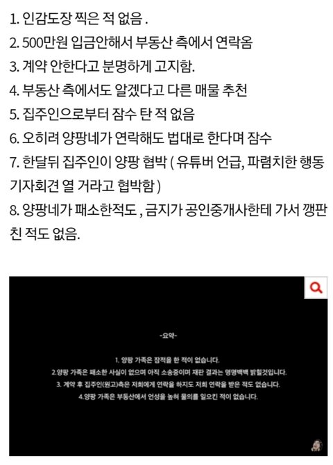 양팡측은 부동산 측에도 연락을 하여 매도인과의 만남을 가지려고 노력하였지만 매도인 측은 약속을 어겨가며 나타나지 않았음(양팡 해명영상에 증거 녹음본 있음)
